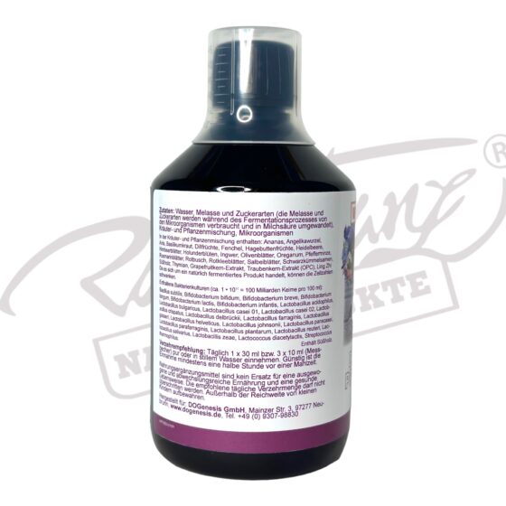 - Unterstützung der Verdauung: Einige der in unserer Mischung enthaltenen Kräuter, wie Ingwer, Fenchel und Pfefferminze, sind traditionell für ihre unterstützende Wirkung auf das Verdauungssystem bekannt. Produktspezifische Angaben:Inhalt: 500mlInhaltsstoffe: Wasser, Melasse und Zuckerarten (die Melasse und Zuckerarten werden während des Fermentationsprozesses von den Mikroorganismen verbraucht und in Milchsäure umgewandelt), Kräuter- und Pflanzenmischung, Mikroorganismen In der Kräuter- und Pflanzenmischung enthalten: Ananas, Angelikawurzel, Anis, Basilikumkraut, Dillfrüchte, Fenchel, Hagebuttenfrüchte, Heidelbeere, Himbeerblätter, Holunderblüten, Ingwer, Olivenblätter, Oreganum, Pfefferminze, Rosmarinblätter, Rotbusch, Rotkleeblätter, Salbeiblätter, Schwarzkümmelsamen, Süßholz, Thymian, Grapefruitkern-Extrakt, Traubenkern-Extrakt (OPC),Informationen zu den enthaltenen Bakterienkulturen: (Da es sich um ein natürlich fermentiertes Produkt handelt, können die Zellzahlen schwanken. Enthaltene Bakterienkulturen)(ca. 1 • 1011 = 100.000.000.000 Keime pro 100 ml): Bacillus subtilis, Bifidobacterium bifidum, Bifidobacterium breve, Bifidobacterium longum, Bifidobacterium lactis, Bifidobacterium infantis, Lactobacillus acidophilus, Lactobacillus bulgaricus, Lactobacillus casei 01, Lactobacillus casei 02, Lactobacillus crispatus, Lactobacillus delbrückii, Lactobacillus farraginis, Lactobacillus gasseri, Lactobacillus helveticus, Lactobacillus johnsonii, Lactobacillus paracasei, Lactobacillus parafarraginis, Lactobacillus plantarum, Lactobacillus reuteri, Lactobacillus salivarius, Lactobacillis zeae, Lactococcus diacetylactis. Streptococcus thermophilus. Enthält Süßholz.Verzehrempfehlung: Täglich 1 x 30 ml bzw. 3 x 10 ml (Meßbecher) pur oder in stillem Wasser einnehmen. Günstig ist die Einnahme mindestens eine halbe Stunde vor der Mahlzeit