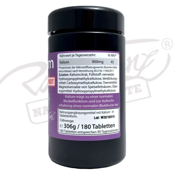 Kalium  900mg       45 %NRV (Prozentsatz der Nährstoffbezugswerte (Nutrient Reference Values) nach Verordnung (EU) Nr. 1169/201)