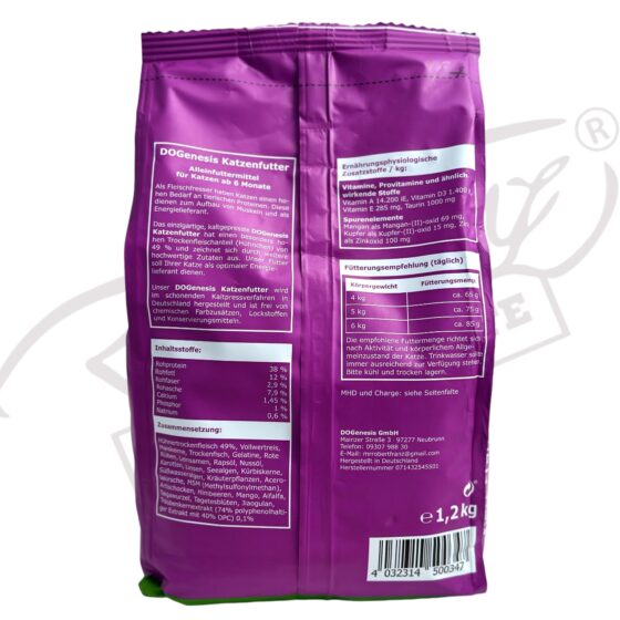 Unser DOGenesis Katzenfutter wird im schonenden Kaltpressverfahren in Deutschland hergestellt und ist frei von chemischen Farbzusätzen, Lockstoffen und Konservierungsmitteln.