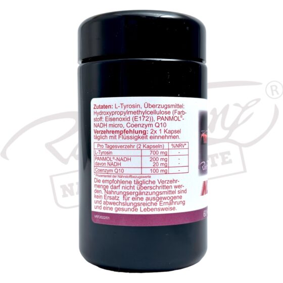 | Zutaten | L-Tyrosin, Überzugsmittel: Hydroxypropylmethylcellulose (Farbstoff: Eisenoxid (E172)), PANMOL®-NADH micro, Coenzym Q10 |
