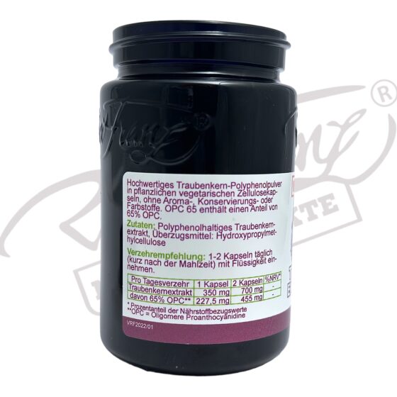 „OPC Kapseln Robert Franz“ Pro Kapsel bedeutet dies 140 mg reines OPC je enthaltenen 350 mg Traubenkernextrakt.