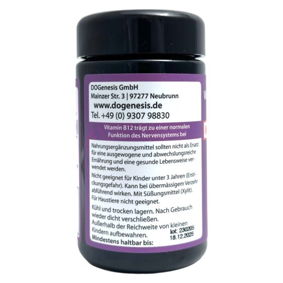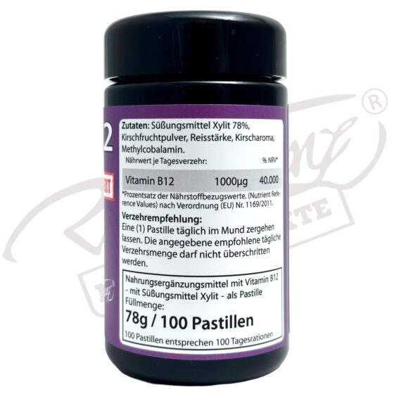 Inhaltsstoffe: Jede Pastille enthält 1.000 mcg Vitamin B12 (= 40.000 % NRV*).