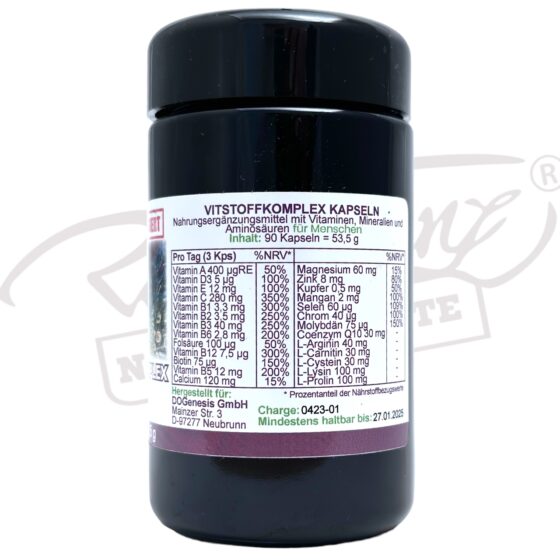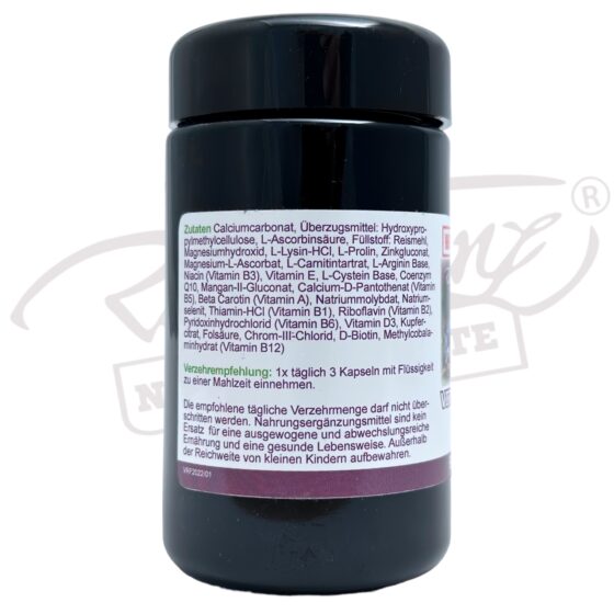 Zutaten: Calciumcarbonat, Kapselhülle Hydroxypropylmethylcellulose, Citrus Fruchtextrakt, L-Ascorbinsäure, Magnesiumhydroxid, L-Lysin-HCl, L-Prolin, L-Ascorbylpalmitat, Zinkgluconat, Magnesium-L-Ascorbat, L-Carnitintartrat, L-Arginin Base, Niacin (Vitamin B3), Vitamin E, L-Cystein Base, Coenzym Q10, Reismehl, Mangan-II-Gluconat, Calcium-D-Pantothenat (Vitamin B5), Beta Carotin (Vitamin A), Natriummolybdat, Natriumselenit, Thiamin-HCl (Vitamin B1), Riboflavin (Vitamin B2), Pyridoxinhydrochlorid (Vitamin B6), Vitamin D3, Kupfercitrat, Folsäure, Chrom-III-Chlorid, D-Biotin, Methylcobalaminhydrat (Vitamin B12)