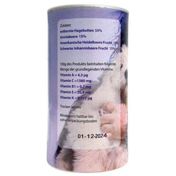Zutaten: entkernte Hagebutten 55% Aroniabeere 15% Amerikanische Heidelbeere Frucht 15% Schwarze Johannisbeere Frucht 15% Nettoinhalt: 200 g